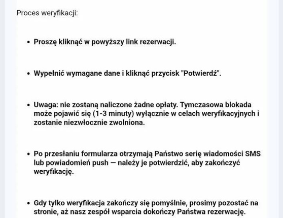 Nie zabrakło też szczegółowej informacji o rzekomym „procesie weryfikacji”. Jeżeli przyjrzymy się uważnie, każdy punkt powinien zwrócić naszą uwagę, sprowokować do zastanowienia się oraz zatrzymania przed podjęciem jakichkolwiek działań. Tak nie powinno wyglądać potwierdzanie rezerwacji.