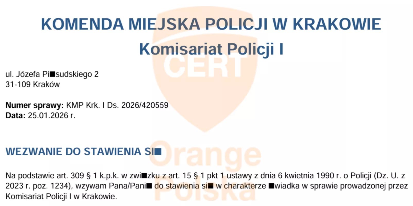 W tym przypadku po rozpakowaniu archiwum pojawia się wiele komunikatów błędów, wśród których trudno dostrzec próby utworzenia pliku w niepokojącej lokalizacji. Plik PDF znajdujący się w archiwum to wezwanie do stawienia się rzekomo pochodzące od „Komendy Miejskiej Policji w Krakowie”. Może to stanowić podpowiedź w jaki sposób adresat złośliwej wiadomości mógł być zachęcany do otwarcia archiwum. Gdy ofiara jest zajęta przypomnieniem sobie o jakie zdarzenie drogowe może chodzić w „wezwaniu”, w tle wykonuje się złośliwe oprogramowanie.