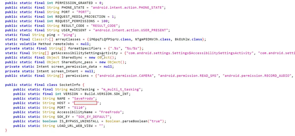 Rys. 10. Zdekompilowana i zdekodowana klasa SpyNote – konfiguracja sieciowa