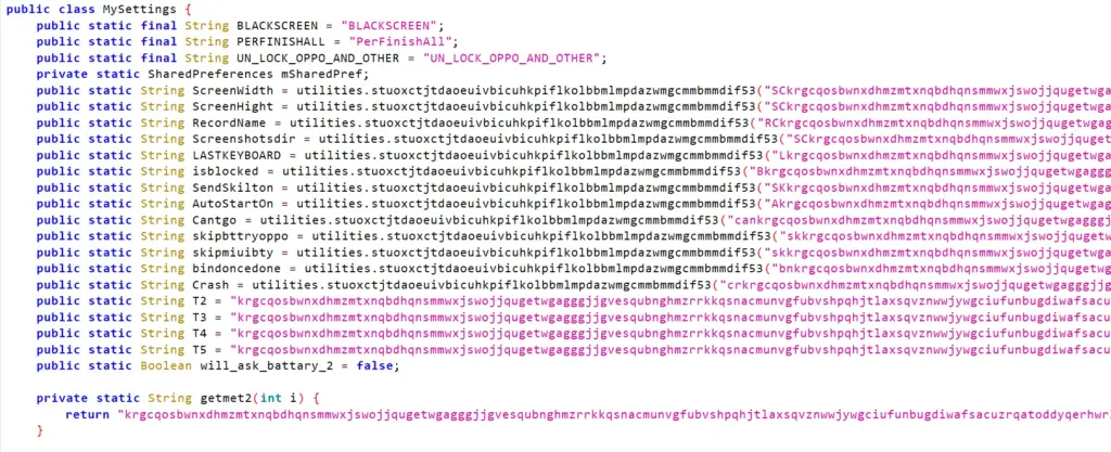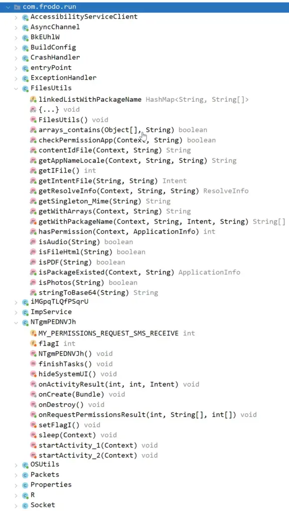 Najnowsze wersje SpyNote korzystają z komercyjnych pakerów oraz zaawansowanego zaciemniania ciągów znaków. Sprawia to, że kod aplikacji jest nieczytelny dla standardowych dekompilatorów, co utrudnia identyfikację złośliwych funkcji. Często używane są obfuskowane nazw klas i usług (np. klasy o nazwach C71 czy C38), by ukryć złośliwe procesy wśród legalnych usług systemowych. W wielu próbkach obserwuje się także sztuczne wypełniacze kodu (dead code), fałszywe klasy oraz zagnieżdżone bloki try/catch, które utrudniają analizę algorytmów.