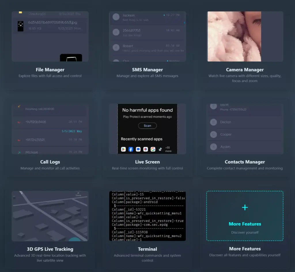 Panel umożliwia dynamiczne aktywowanie poszczególnych modułów malware w odpowiedzi na bieżące potrzeby operatora. Obejmuje to między innymi uruchamianie podglądu ekranu, przechwytywanie obrazu z kamery, nagrywanie dźwięku, śledzenie lokalizacji, przeglądanie plików oraz monitorowanie komunikacji. Funkcje te mogą być aktywowane w czasie rzeczywistym, co pozwala na elastyczne prowadzenie działań inwigilacyjnych oraz dostosowywanie ich do zachowania ofiary.