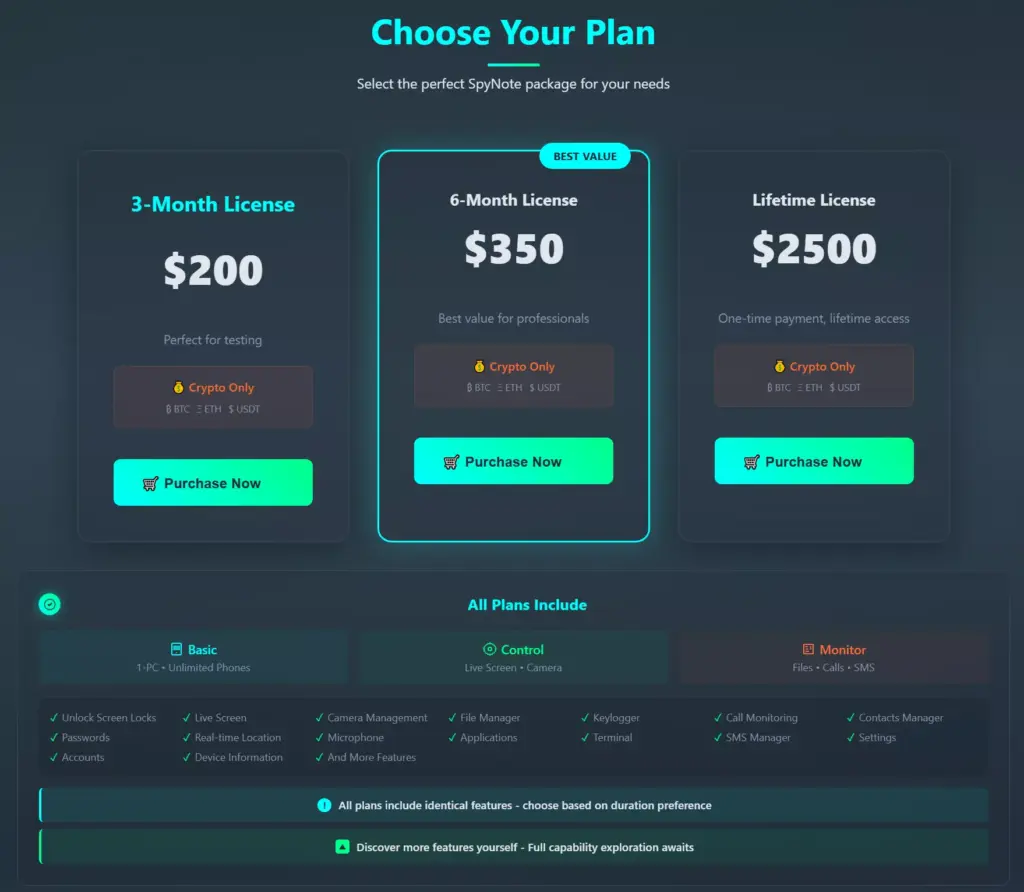 Z punktu widzenia modelu biznesowego panel administracyjny SpyNote jest oferowany w ramach płatnych licencji czasowych oraz dożywotnich. Dostępne są pakiety obejmujące kilkumiesięczne licencje testowe, średnioterminowe oraz jednorazowy zakup zapewniający stały dostęp do narzędzia. Charakterystycznym elementem jest akceptowanie płatności wyłącznie w kryptowalutach, takich jak Bitcoin, Ethereum czy USDT, co jest typowym rozwiązaniem stosowanym w środowisku narzędzi o podwyższonym ryzyku prawnym i operacyjnym.