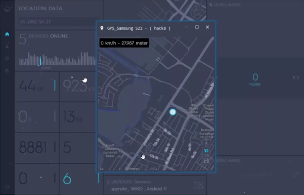 Jednym z bardziej zaawansowanych komponentów panelu administracyjnego jest moduł lokalizacji, oferujący śledzenie położenia urządzenia w czasie rzeczywistym z wykorzystaniem danych GPS. Funkcja ta prezentowana jest w formie interaktywnej mapy z trójwymiarową wizualizacją, umożliwiającą dokładne monitorowanie przemieszczania się ofiary. W połączeniu z innymi modułami pozwala to na korelację aktywności użytkownika z jego fizyczną lokalizacją. Stałe śledzenie urządzenia jest możliwe dzięki połączeniu uprawnień do lokalizacji oraz usługi działającej w tle, co oznacza, że użytkownik otrzymuje minimalne alerty systemowe lub nie otrzymuje żadnych.