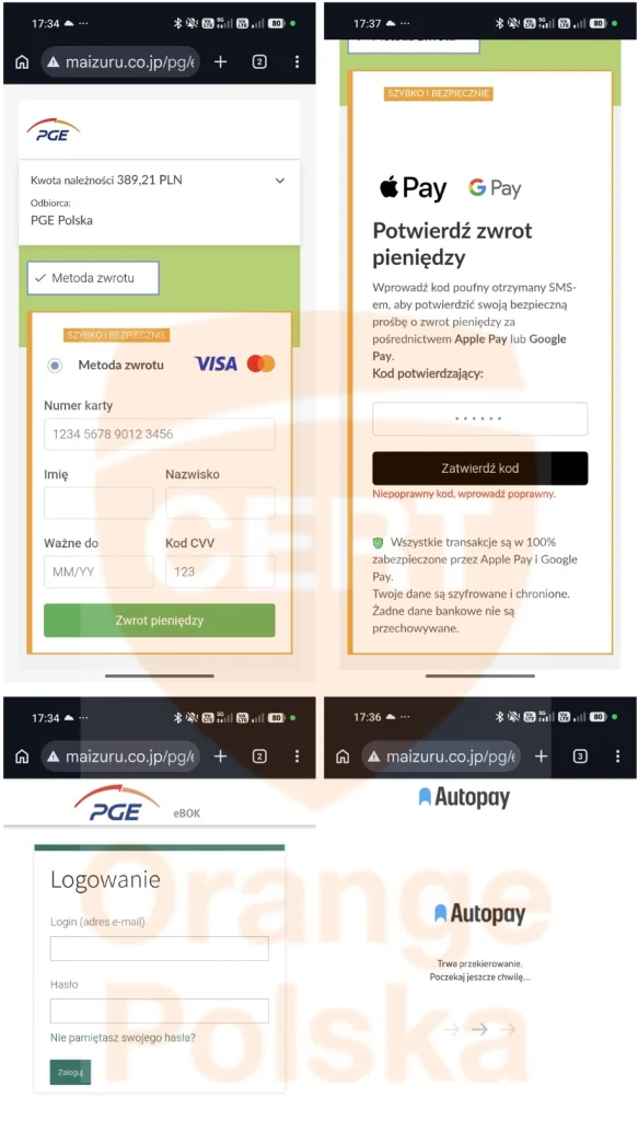 Obie wiadomości „od PGE” pozwalają ofierze kliknąć w przycisk „Weryfikuj dane ewidencyjne” przekierowujący użytkowników mobilnych na stronę phishingową. Tam proszeni są o podanie swoich danych wraz z danymi karty bankowej, celem rzekomego „zwrotu należności”. Dlaczego strona phishingowa nie wyświetla się użytkownikom komputerów?