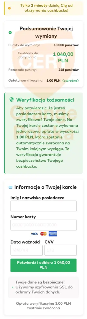 Po co podać dane karty skoro nie mam niczego płacić, a jedynie otrzymać na nią pieniądze? Tu oszuści wykorzystali sprytną socjotechniczną sztuczkę. Sugerują, iż pobranie w wysokości 1 PLN jest niezbędne, by zagwarantować bezpieczeństwo naszego cashbacku. My przelejemy złotówkę, a oni od razu nam ją oddadzą, dodając też kwotę cashbacku. Tylko, że… nie.