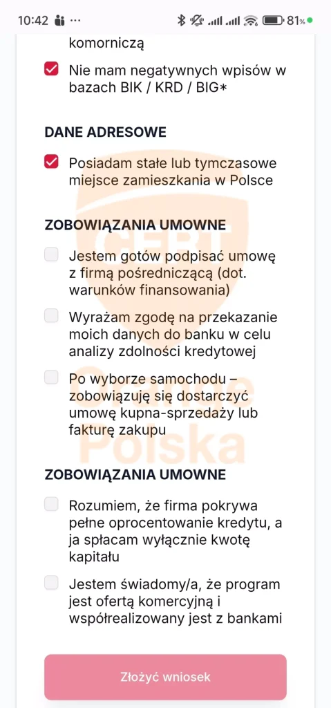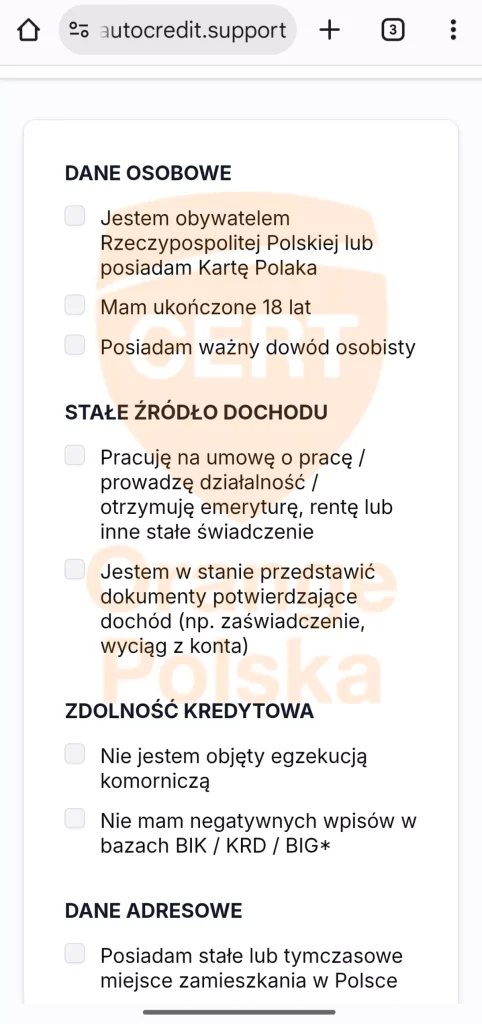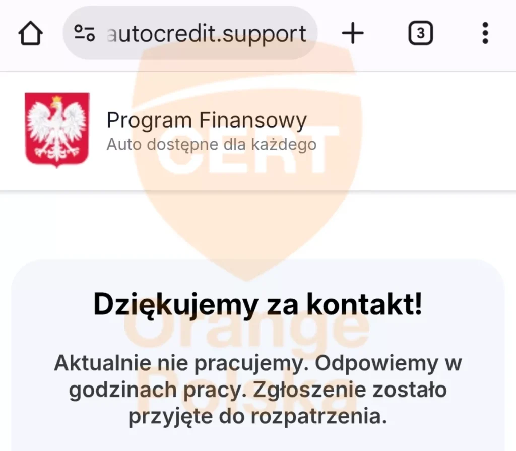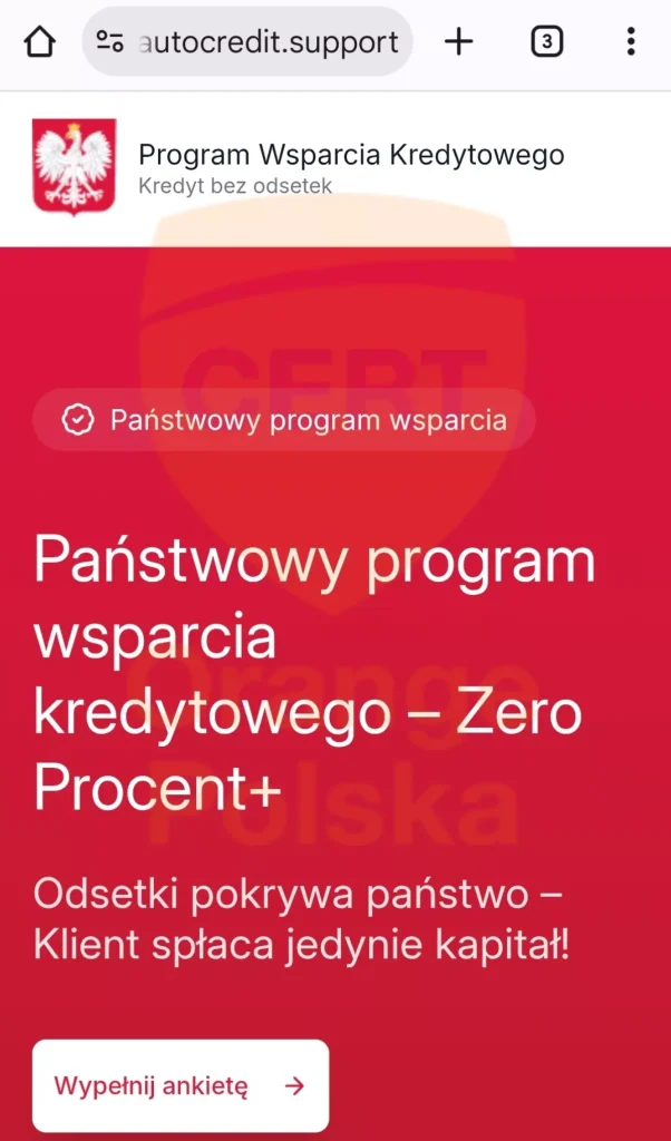 Po kliknięciu w link trafiamy na stronę hxxps://autocredit[.]support. Kolorystyka witryny utrzymana jest w stylu serwisów rządowych, przekaz wzmacnia herb Rzeczypospolitej Polski w prawym górnym rogu, jak w przypadku witryn gov.pl.