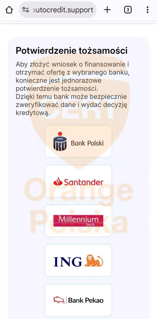 Po wyborze banku pojawia się kopia jego witryny logowania, oczywiście niezmiennie w domenie autocredit[.]support. Ofiara, myśląc, że loguje się do banku, tak naprawdę podaje dane logowania oszustom. Co dzieje się potem?